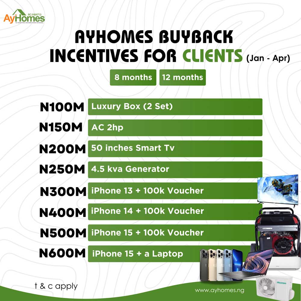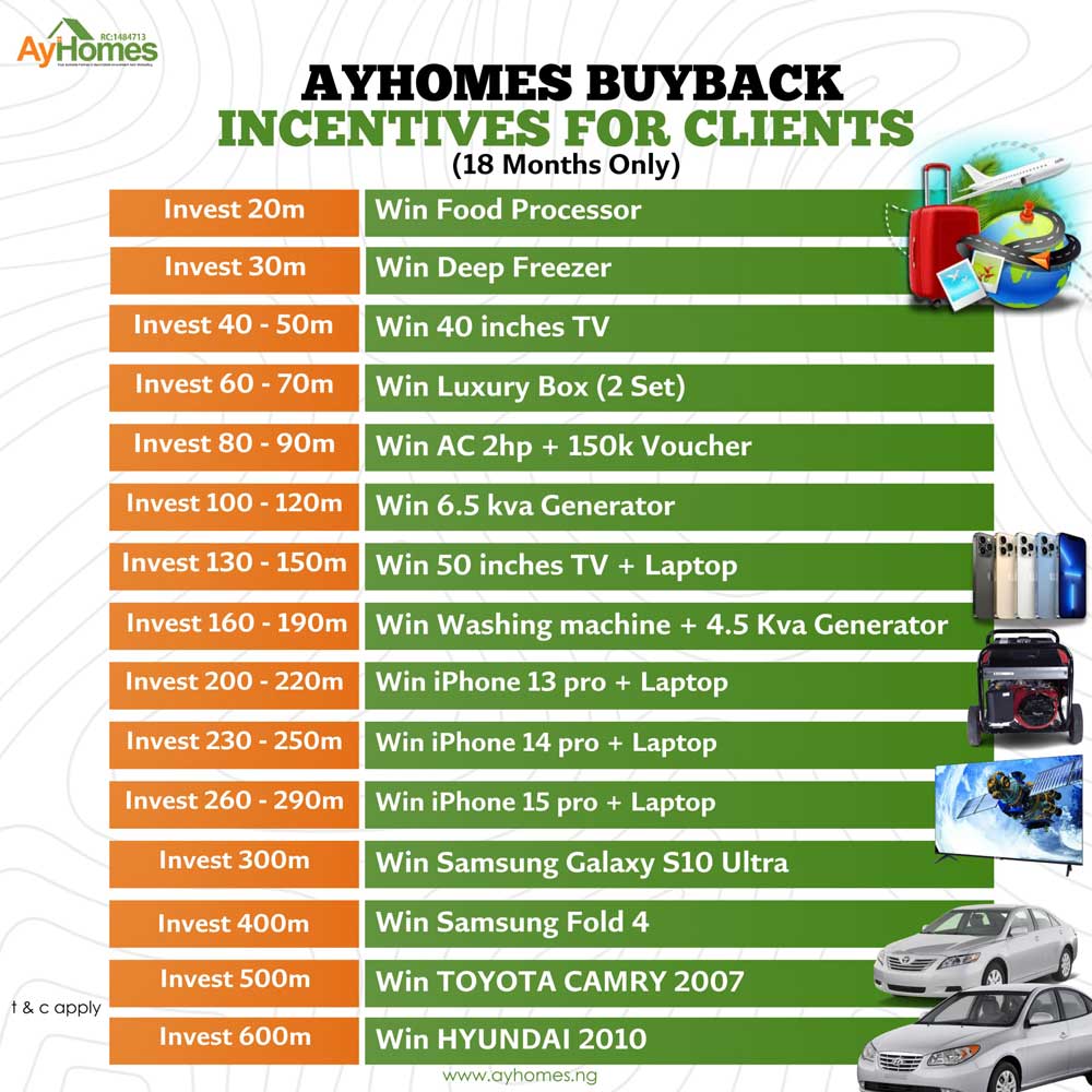 Now is the perfect time to invest in land and enjoy incredible rewards! As part of our exclusive Buy-Back Scheme, we are offering fantastic incentives to our valued clients. When you purchase land through this program, you stand a chance to win amazing prizes, including cars, iPhones, laptops, smart TVs, air conditioners, deep freezers, washing machines, and more!